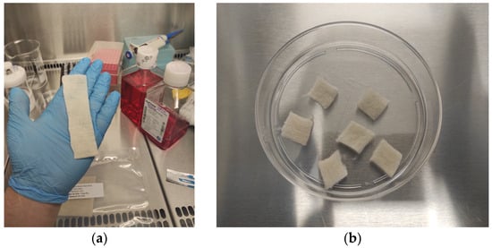 After leaching, sheets were dried at room temperature and cut into 1 × 1 cm2 pieces for subsequent cell seeding. Prior to cell culture, the scaffolds were sterilized by soaking in 70% ethanol for 30 min and exposing to UV light for 1 h per side in a laminar flow hood.