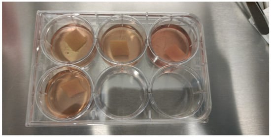Chondrocytes were seeded onto 1 × 1 cm pieces of PLGA (poly(lactic-co-glycolic acid)) scaffold at a density of 1.2 × 106 cells per piece (Figure 2). The seeded PLGA sheets were placed in 6-well plates, each containing 5 mL of DMEM High-Glucose medium supplemented with 10% FBS, 1% Penicillin-Streptomycin, and 10 ng/mL TGF-β1 (Figure 3). The cultures were incubated at 37 °C in a 5% CO2 atmosphere for 21 days. Medium changes were performed every 72 h. After the culture period, the PLGA sheets were stained with Hematoxylin-Eosin (H&E) and Toluidine Blue to evaluate cell morphology and ECM production. Staining interpretation was guided by comparison with unseeded control scaffolds to distinguish ECM production from background PLGA absorption.