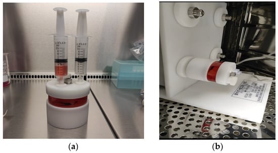 (a) Chondrocytes are seeded onto the cut biopolymers, which are then placed in a 55 mL STLV. (b) The 55 mL STLV is cultured by integrating it into the RCCS system in the incubator.