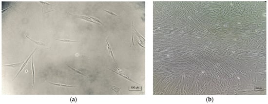 (a) MSCs after 48 h of isolation and washing. (b) Microscopic image of confluent stem cells ready for passage.