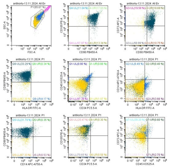 Characterization was performed every 5–7 days, depending on the growth rate, and cells were characterized at passage 3. MSCs were analyzed for surface markers by flow cytometry. For surface marker analysis, 1 × 106 cells were incubated with monoclonal antibodies against CD90, CD105, and CD73 (positive markers) and CD14, CD34, CD45, and HLA-DR (negative markers). Fluorescence was measured using a CytoFlex cytometer (Beckman Coulter, Brea, CA, USA) with CytExpert 2.4 software (Beckman Coulter, Brea, CA, USA). These markers align with the International Society for Cellular Therapy (ISCT) criteria for defining human MSCs. CD73, CD90, and CD105 are adhesion and differentiation-related proteins commonly expressed on MSCs, while CD14, CD34, CD45, and HLA-DR are hematopoietic or immune markers used to exclude non-MSC populations.