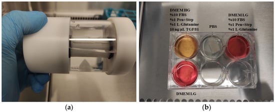 For the 3D static culture, PLGA pieces were incubated in different media (1st well: DMEM High-Glucose medium supplemented with 10% FBS, 1% Penicillin-Streptomycin, and 10 ng/mL TGF-β1, 2nd well: PBS, 3rd well: DMEM Low-Glucose medium supplemented with 10% FBS and 1% Penicillin-Streptomycin, 4th well: DMEM Low-Glucose medium) in a 6-well plate at 37 °C and 5% CO2.