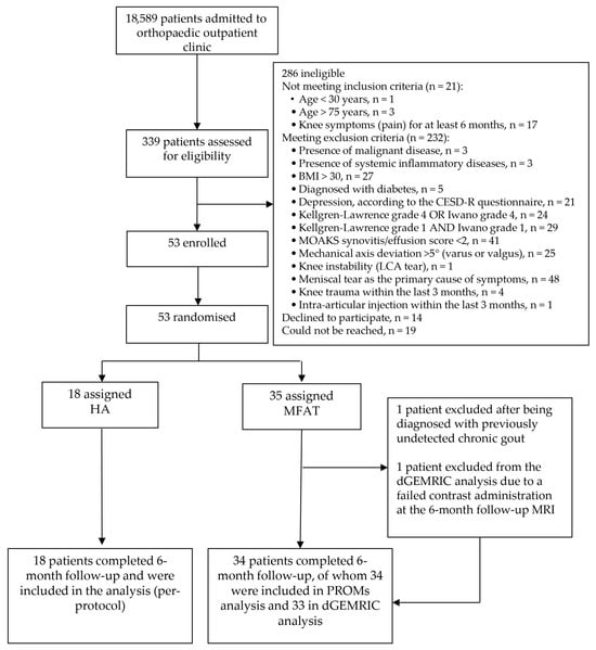 Figure 1. CONSORT flow diagram illustrating participant recruitment, eligibility screening, randomization, follow-up, and analysis. Of 339 patients assessed for eligibility, 53 were randomized to receive either microfragmented adipose tissue (MFAT) or hyaluronic acid (HA) injections. Eligibility was determined using strict radiographic, clinical, and MRI-based phenotyping. PROMs and dGEMRIC analyses were conducted according to the per-protocol principle. Reasons for exclusion are detailed, including specific inclusion and exclusion criteria, as well as technical issues affecting imaging analysis.