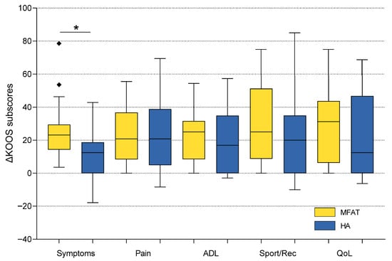 Figure 2. Comparison of KOOS subscale improvements (baseline to 6 months) between microfragmented adipose tissue (MFAT) and hyaluronic acid (HA) groups. Box plots illustrate the distribution of score changes, with median, interquartile range, and outliers. The MFAT group showed a significantly greater improvement in KOOS Symptoms (p = 0.008), while no significant between-group differences were observed in the other subscales. The Mann–Whitney U test was used for statistical analysis. Squares represent outliers. An asterisk indicates a statistically significant difference between groups. KOOS—Knee Injury and Osteoarthritis Outcome Score; ADL—Activities of Daily Living; Sport/Rec—Sports and Recreational Activities; QoL—Quality of Life.