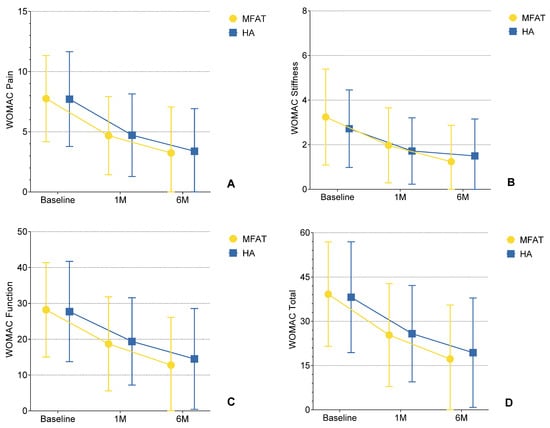 Figure 3. (AD) Changes in WOMAC subscale scores (Pain, Stiffness, Physical Function, and Total) over time following intra-articular injection of microfragmented adipose tissue (MFAT) or hyaluronic acid (HA). Each plot depicts mean values ± standard deviation (SD) error bars at baseline, 1-month, and 6-month follow-up. During the follow-up period from 1 to 6 months, all outcomes in all subscales were statistically significant in comparison to baseline (p < 0.01), demonstrating a sustained treatment effect in the MFAT group. In contrast, significant improvements from baseline to 1 month (p < 0.01) were observed in the HA group, followed by no significant change from 1 to 6 months (p > 0.05), suggesting a plateau effect between 1 and 6 months. These findings visually support the hypothesis that MFAT provides more prolonged clinical improvement in inflammatory knee OA compared to HA.