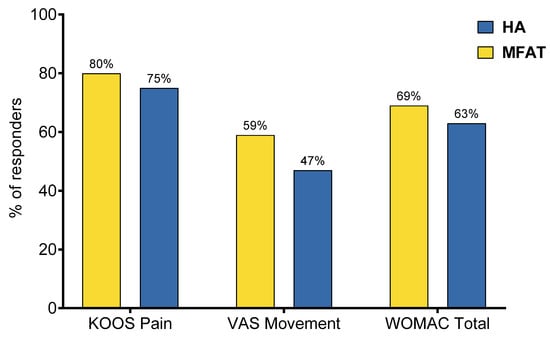 Figure 4. Proportion of responders in each treatment group according to established minimal clinically important difference (MCID) thresholds: KOOS Pain (≥10), VAS Movement (>2), and WOMAC Total (≥15). Despite no statistically significant differences (p > 0.05 for all comparisons, Fisher’s exact test for KOOS Pain and WOMAC Total, Chi-square test for VAS Movement), the MFAT group consistently showed higher responder rates across all outcome measures, suggesting a trend toward greater clinical benefit.