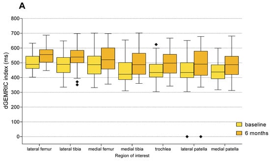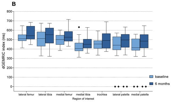 Figure 5. Changes in dGEMRIC indices from baseline to 6 months follow-up in each anatomical region of interest (ROI), shown separately for the MFAT (A) and HA (B) treatment groups. Boxplots represent median and interquartile range, with light colors indicating baseline values and darker shades representing follow-up measurements. Statistically significant improvements were observed in all compartments within both groups (Paired t-test or Wilcoxon signed-rank test, p < 0.01 for all regions). Squares represent outliers.