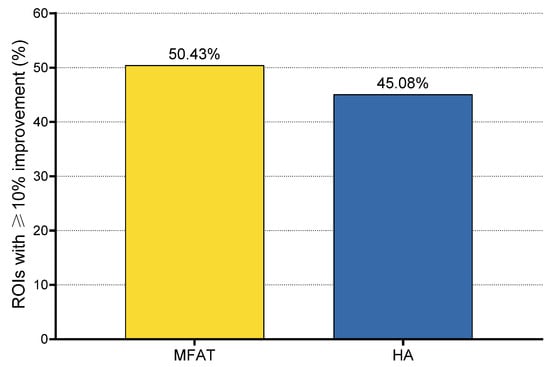 Figure 6. Proportion of regions of interest (ROIs) showing clinically relevant improvement (≥10% increase in dGEMRIC index) 6 months after treatment. Clinically relevant improvement was observed in 55 of 122 ROIs (45.08%) in the HA group and 116 of 230 ROIs (50.43%) in the MFAT group. One clinically relevant deterioration (≥10% decrease) was observed in the MFAT group (0.43%), while no deteriorations were recorded in the HA group.