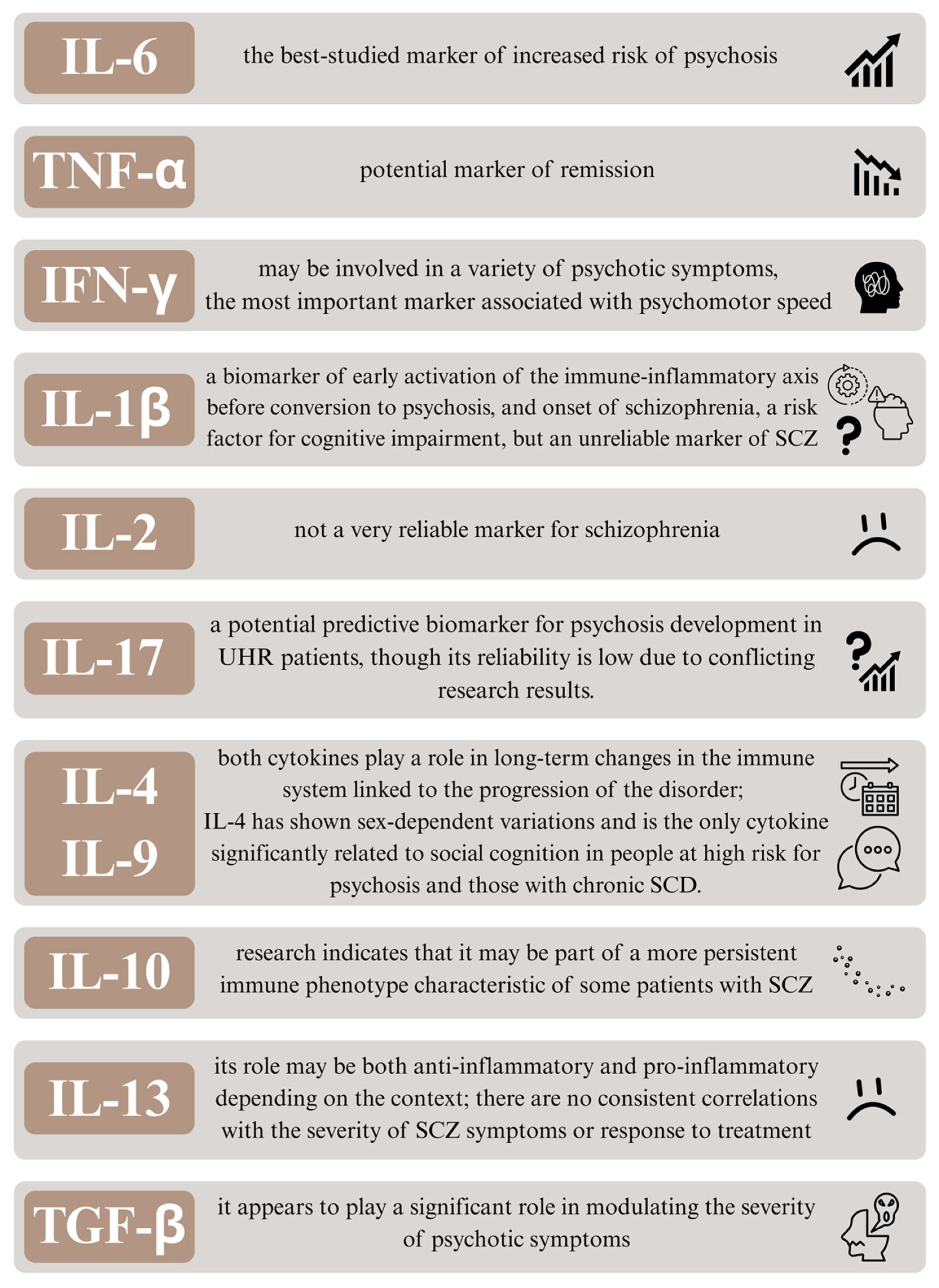 - Reale, M.; Costantini, E.; Greig, N.H. Cytokine Imbalance in Schizophrenia. From Research to Clinic: Potential Implications for Treatment. Front. Psychiatry 2021, 12, 536257. [Google Scholar] [CrossRef]