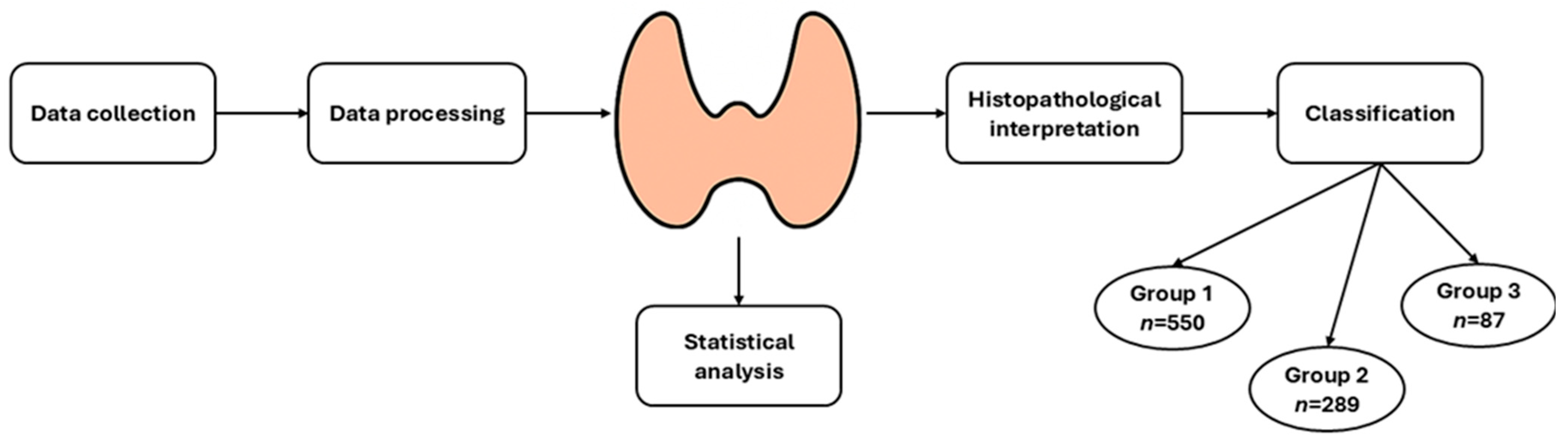 - Surgical data: type of procedure (thyroid lobectomy, subtotal thyroidectomy, or total thyroidectomy);