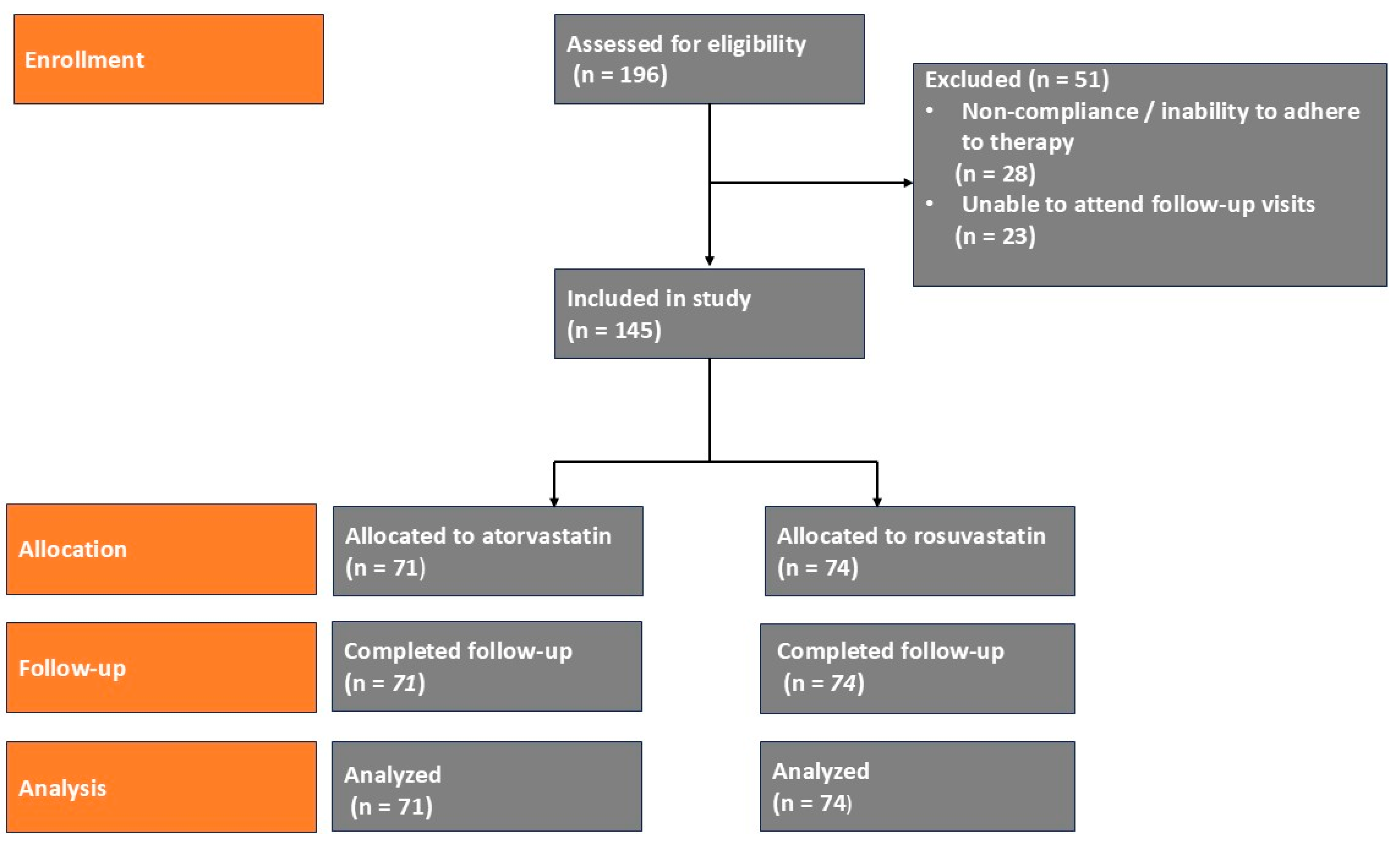 Figure 1). A total of 196 individuals were assessed for eligibility; 51 were excluded due to non-compliance with therapy or inability to attend follow-up visits, leaving 145 participants included in the final analysis.