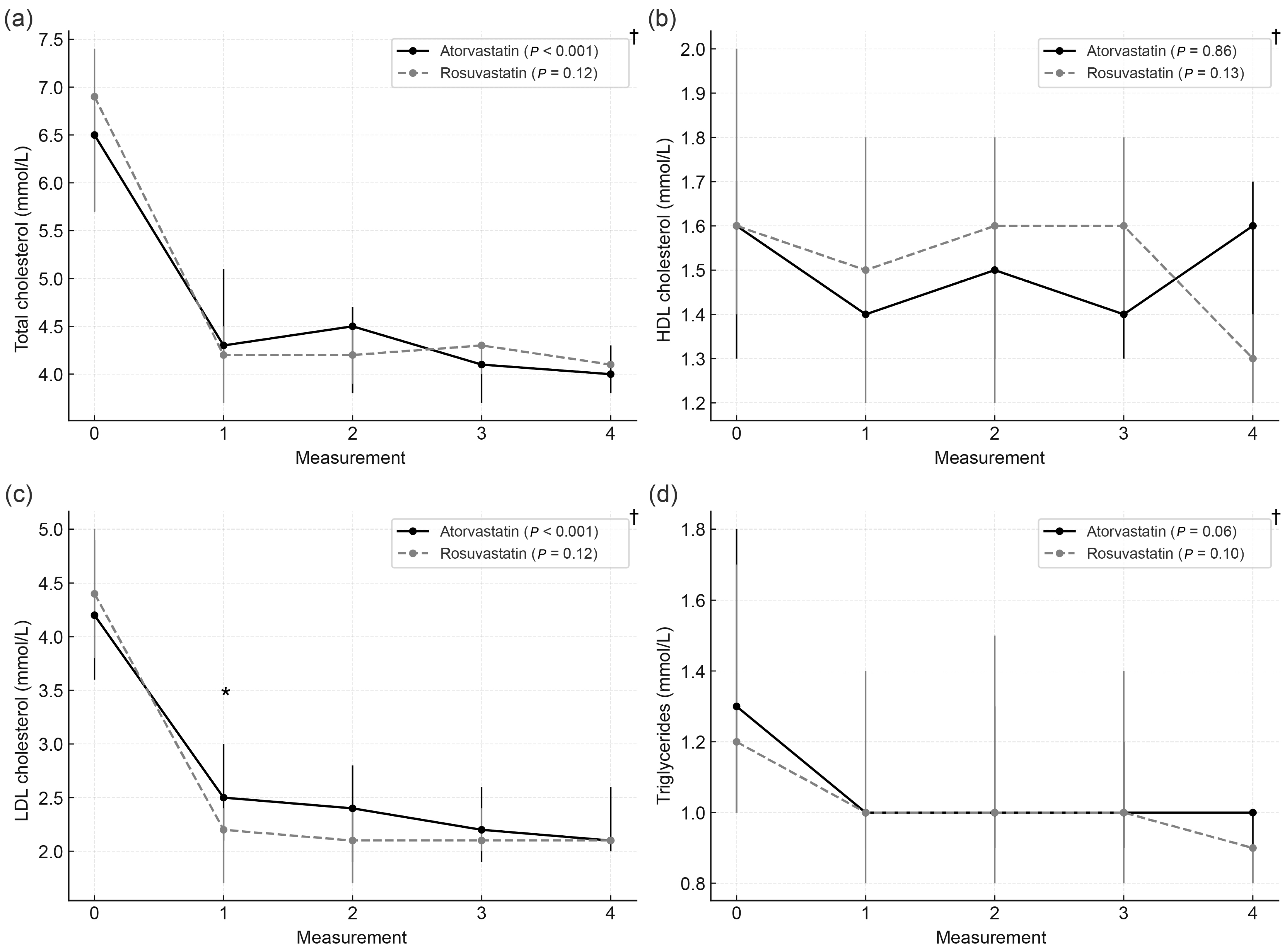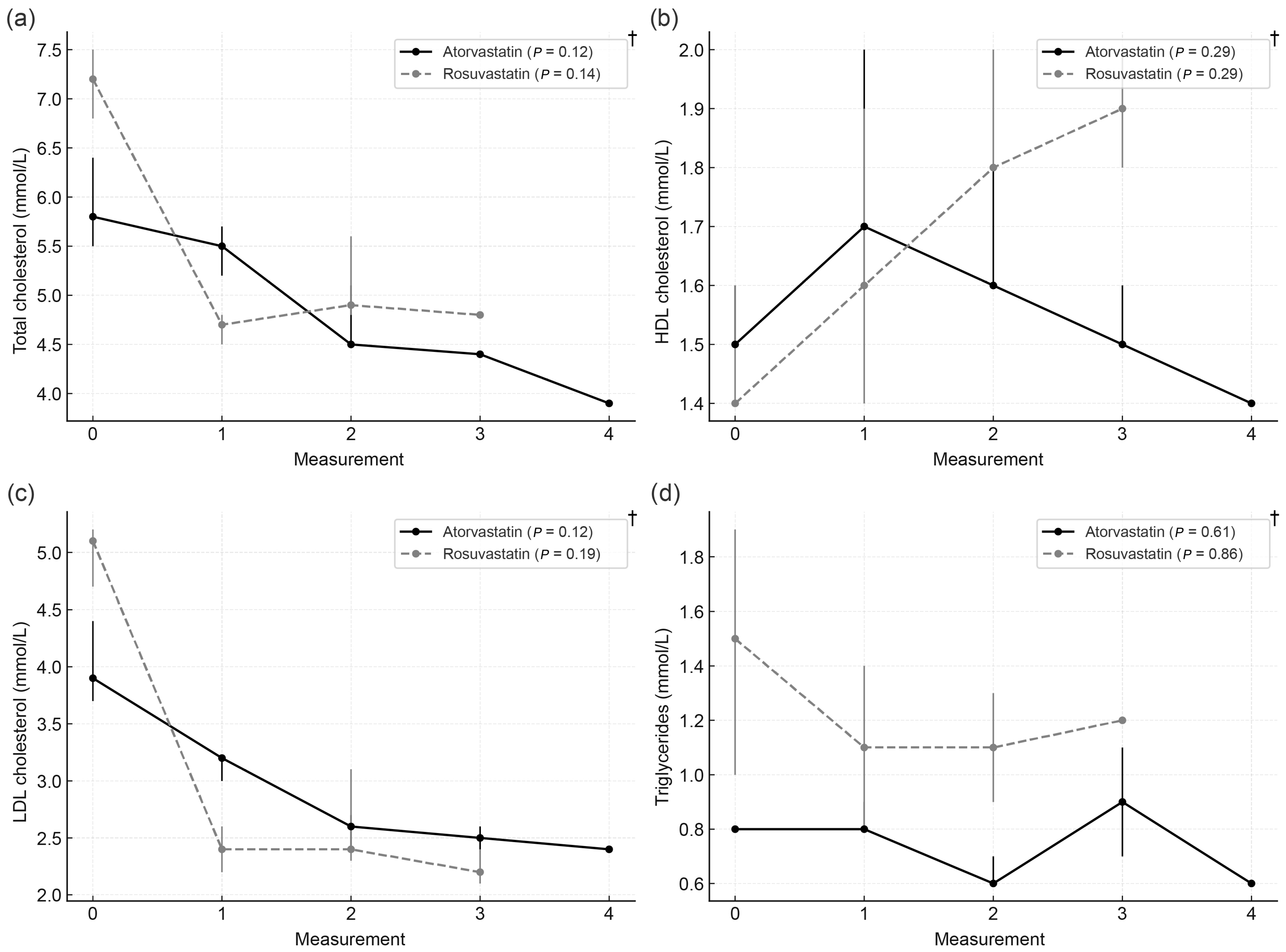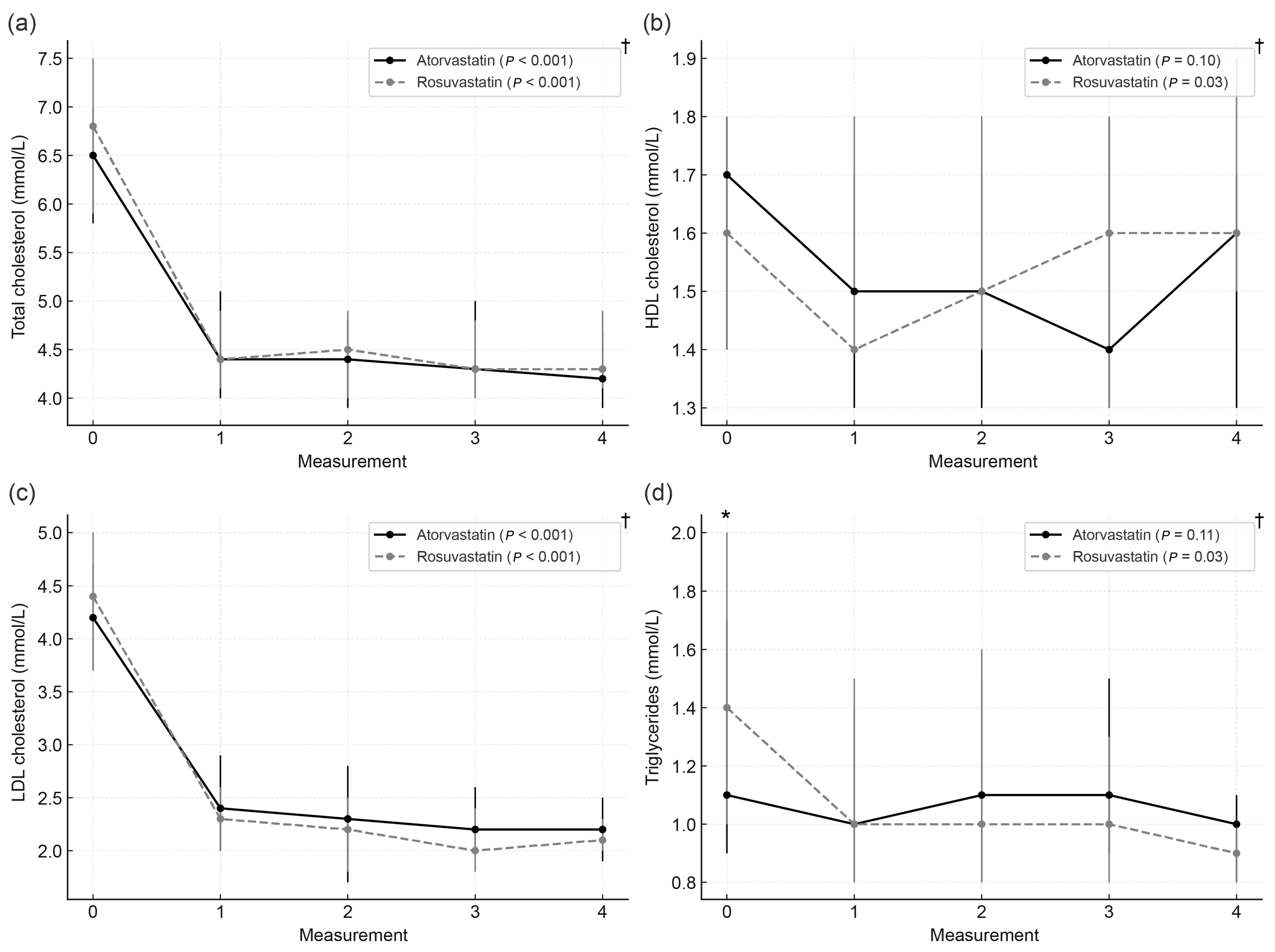 p = 0.09). During follow-up, the rosuvastatin group showed a significant reduction in all lipid fractions, whereas in the atorvastatin group, a decline was observed only in total and LDL cholesterol. Median lipid concentrations at baseline and follow-up visits by statin type are shown in