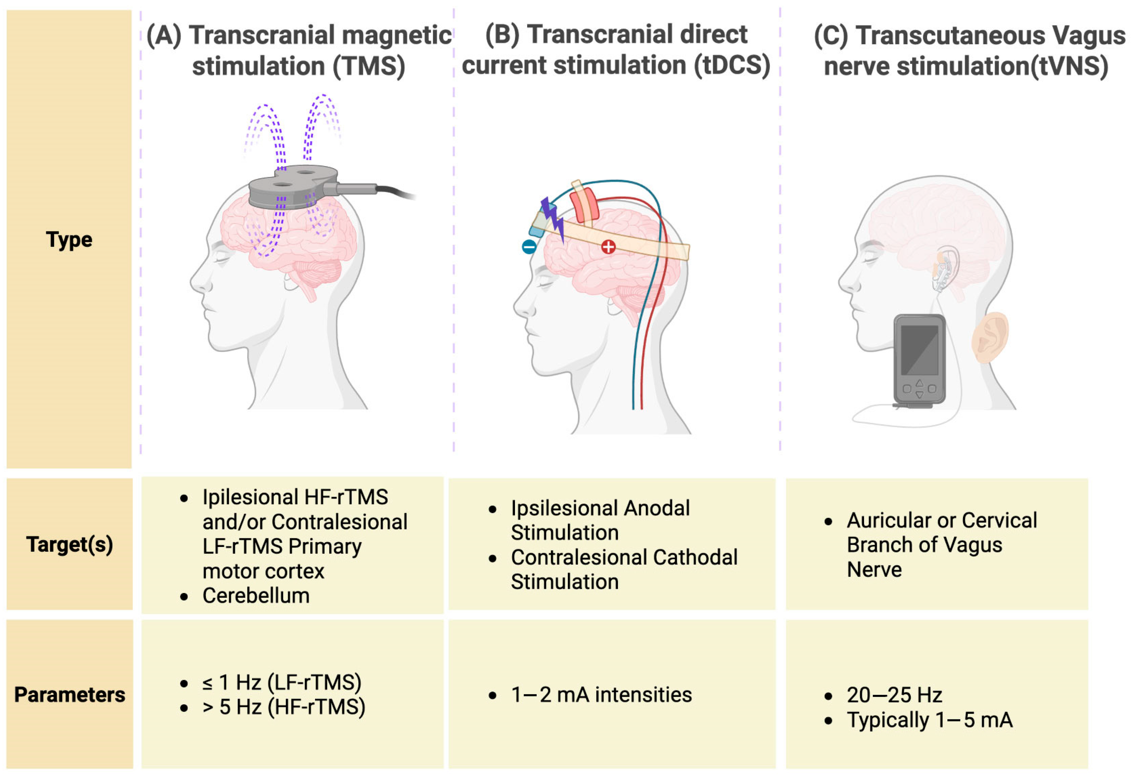 - Dawson, J.; Abdul-Rahim, A.H.; Kimberley, T.J. Neurostimulation for treatment of post-stroke impairments. Nat Rev Neurol. 2024, 20, 259–268. [Google Scholar] [CrossRef]