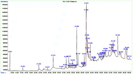 GC/MS chromatograms of CCIE. A prominent peak in the spectrum indicates the major component of the extract, and each peak corresponds to a recognized chemical.