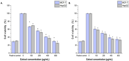Effects of (A), CCLE and (B), CCIE on MCF-7 and HepG2 cell viability, as determined via the MTT assay. The cells were treated with CCLE or CCIE (100, 200, 400, or 800 µg/mL) for 48 h. The mean values ± SD of three independent experiments are shown. (* = p < 0.05 compared with nontreated cells (negative control)).