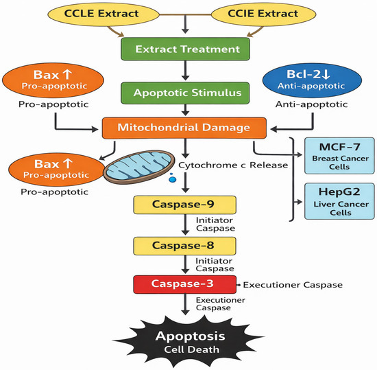 The effects of CCLE and CCIE on HepG2-induced apoptotic signaling and MCF-7 cells were evaluated. The MCF-7 and HepG2 cell lines treated with the seed extract presented increased levels of mRNA expression, according to the results of the rRT–PCR study. The expression of antiapoptotic genes (Bcl-xL and Bcl-2) was lower in the MCF-7 and HepG2 cell lines treated with the plant extract than in the control group (p < 0.05) (Figure 5A,B). The possible mechanism of apoptosis after CCLE and CCIE treatment of MCF-7 and HepG2 cells is depicted in Figure 6.