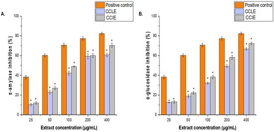 Effects of (A), CCLE and (B), CCIE on α-amylase and α-glucosidase inhibitory activities at various concentrations (25–400 μg/mL). The results are the mean values of three replicates. The results are presented as the means ± SDs of three experiments (* = p < 0.05 compared with the acarbose positive control).