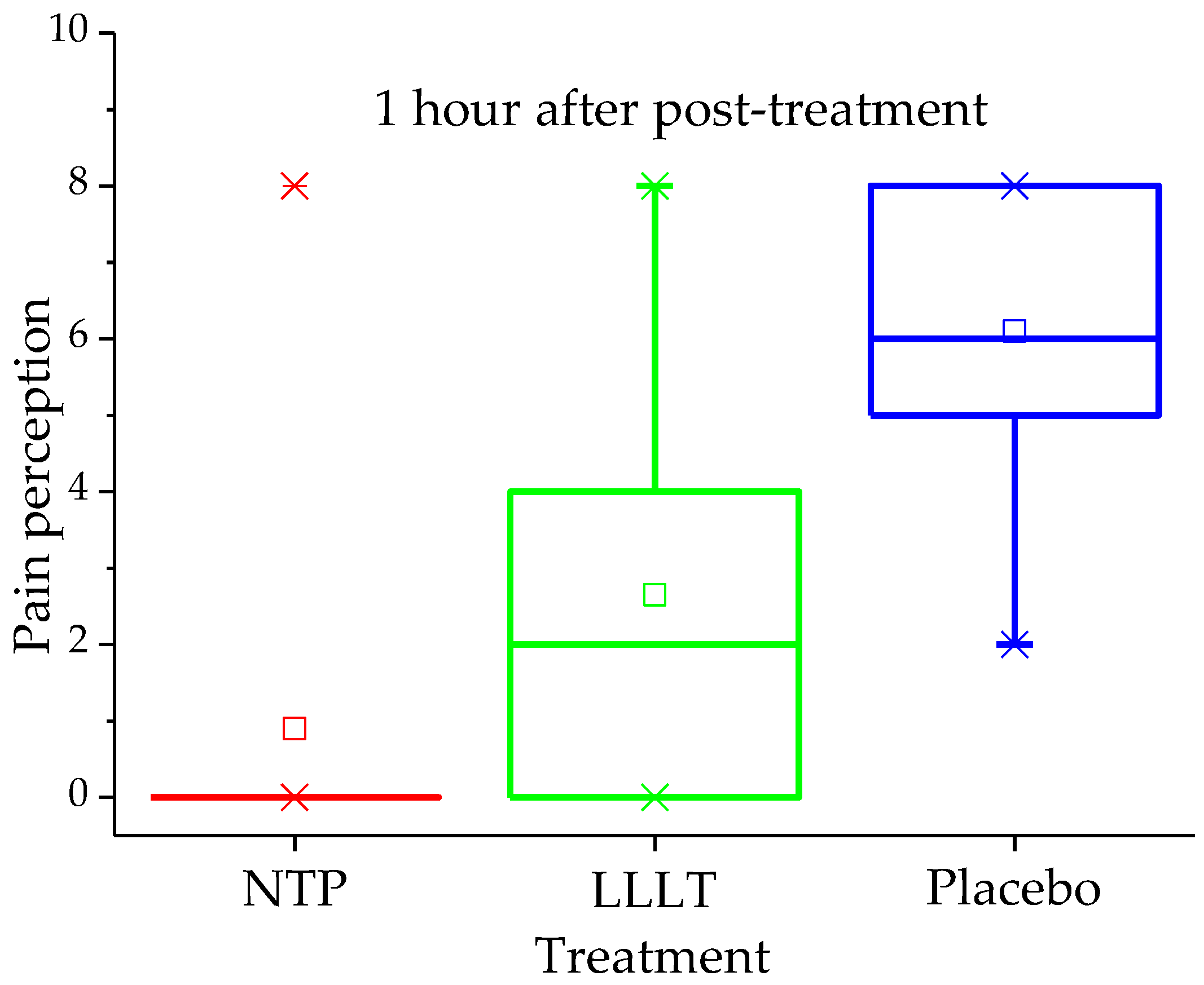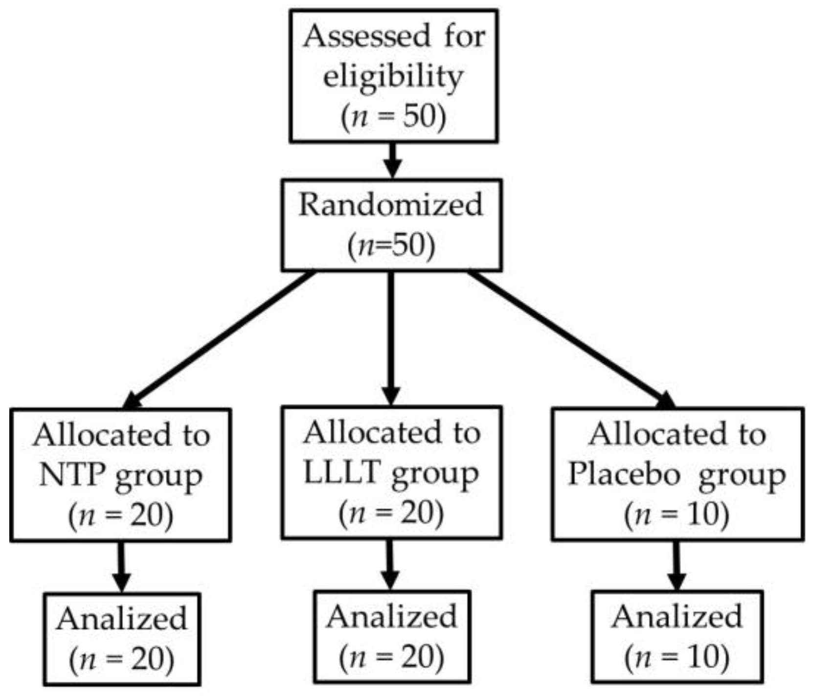 | Parameter | Evaluation Time | NTP (n = 20) | LLLT (n = 20) | Placebo (n = 10) | p-Value |