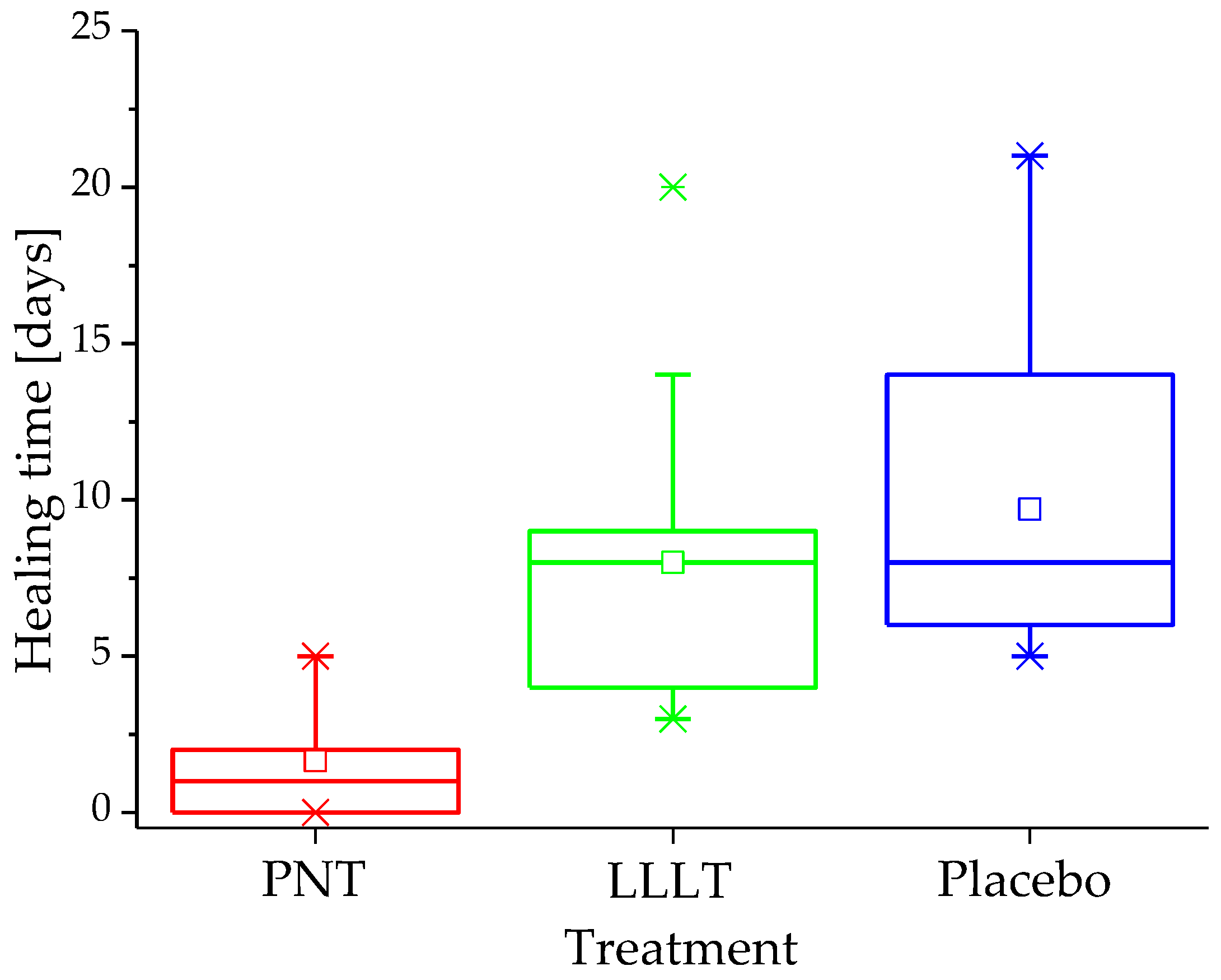 | Healing time [days] | 2.5 ± 1.9 1 (1.6–3.4) | 8.0 ± 4.3 1 (6.0–10.0) | 9.6 ± 5.3 1 (6.3–12.9) | <0.001 | |