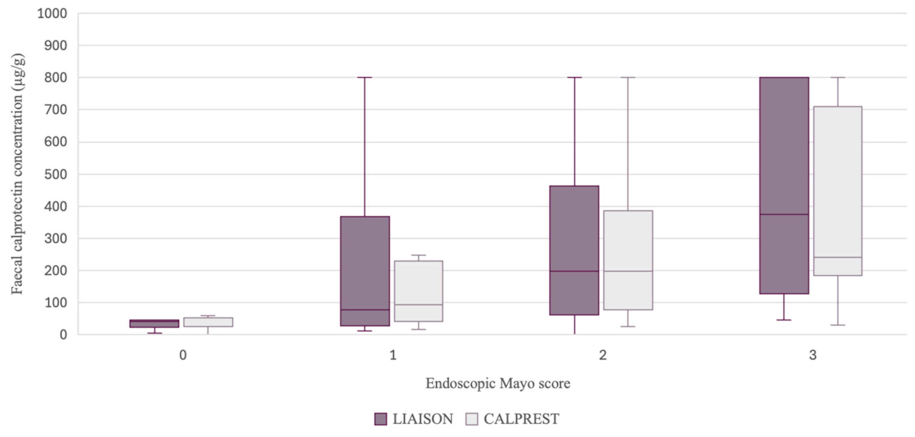 - Pelkmans, L.P.J.; de Groot, M.J.M.; Curvers, J. Analytical Performance and Clinicopathologic Correlation of Four Fecal Calprotectin Methods. Am. J. Clin. Pathol. 2019, 152, 392–398. [Google Scholar] [CrossRef] [PubMed]