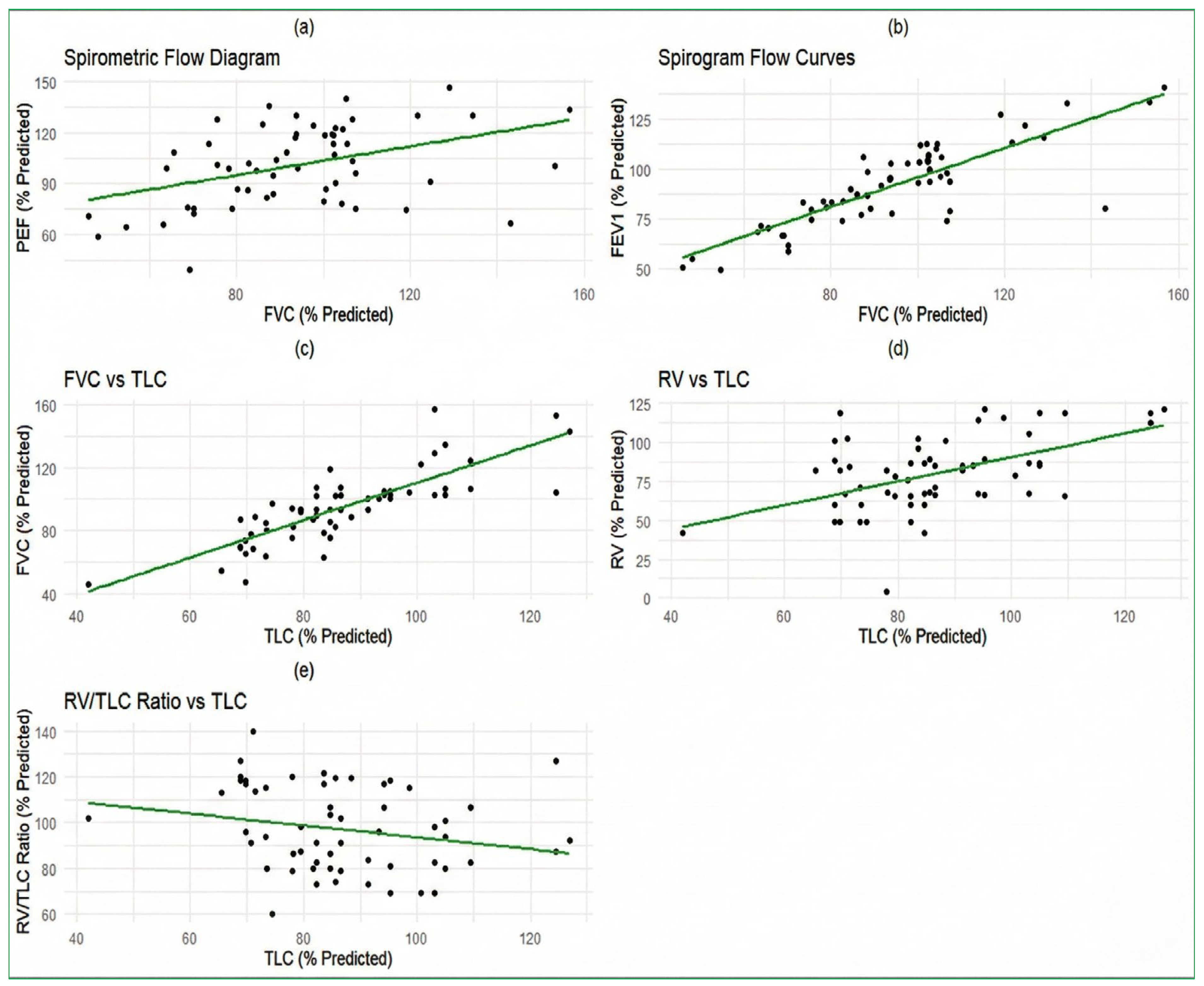 | Combined pattern | Obstructive physiology (FEV1 < 80% predicted and FEV1/FVC ratio < 70%) with reduced lung volumes (FVC < 80% predicted or TLC < 80% predicted) |