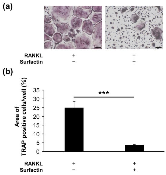 The effect of surfactin on osteoclast formation in RAW264.7 cells was evaluated using TRAP staining. Surfactin administration significantly reduced the number of TRAP-positive multi-nucleated cells induced by RANKL. We also examined the differentiation process of RAW264.7 cells during 4-day RANKL stimulation in the presence or absence of surfactin. We observed that stimulation of surfactin inhibited RANKL-induced osteoclast differentiation during both the early stage (days 0–2) and later stages (days 2–4) of differentiation (Figure 2a–c). To assess the effect of surfactin on osteoclast maturation, F-actin staining was performed. Surfactin inhibited the formation of F-actin rings induced by RANKL (Figure 2d,e). In addition to RAW264.7 cells, a notable reduction in the area TRAP-positive multinucleated cells differentiated from bone marrow cells was observed by the addition of 25 μg/mL surfactin, compared to the RANKL-stimulated control cells (Figure 3).