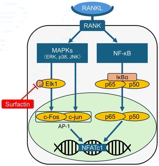 We demonstrated that surfactin suppresses RANKL-induced osteoclast differentiation by negatively regulating the Elk1-AP-1-NFATc1 axis (illustrated in Figure 8). This suggests that surfactin may be a promising candidate for application in novel therapeutic approaches targeting metabolic bone diseases and inflammatory bone destruction.