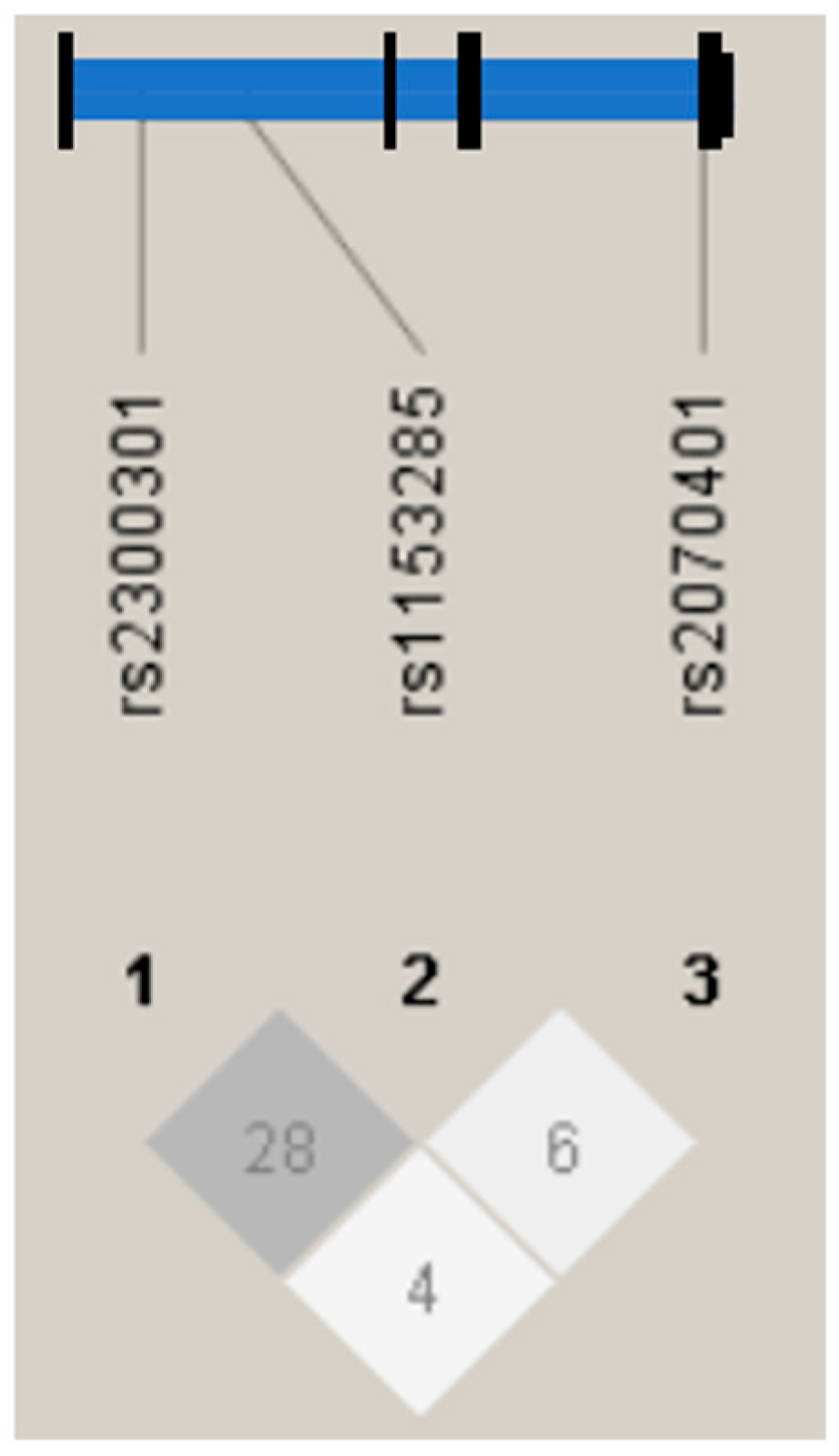 - Barrett, J.C.; Fry, B.; Maller, J.; Daly, M.J. Haploview: Analysis and visualization of LD and haplotype maps. Bioinformatics 2005, 21, 263–265. [Google Scholar] [CrossRef]