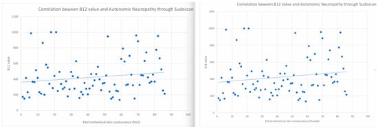The relationship between levels of Vitamin B12 and the presence of autonomic neuropathy was evaluated by Sudoscan (left for feet and right for hands).