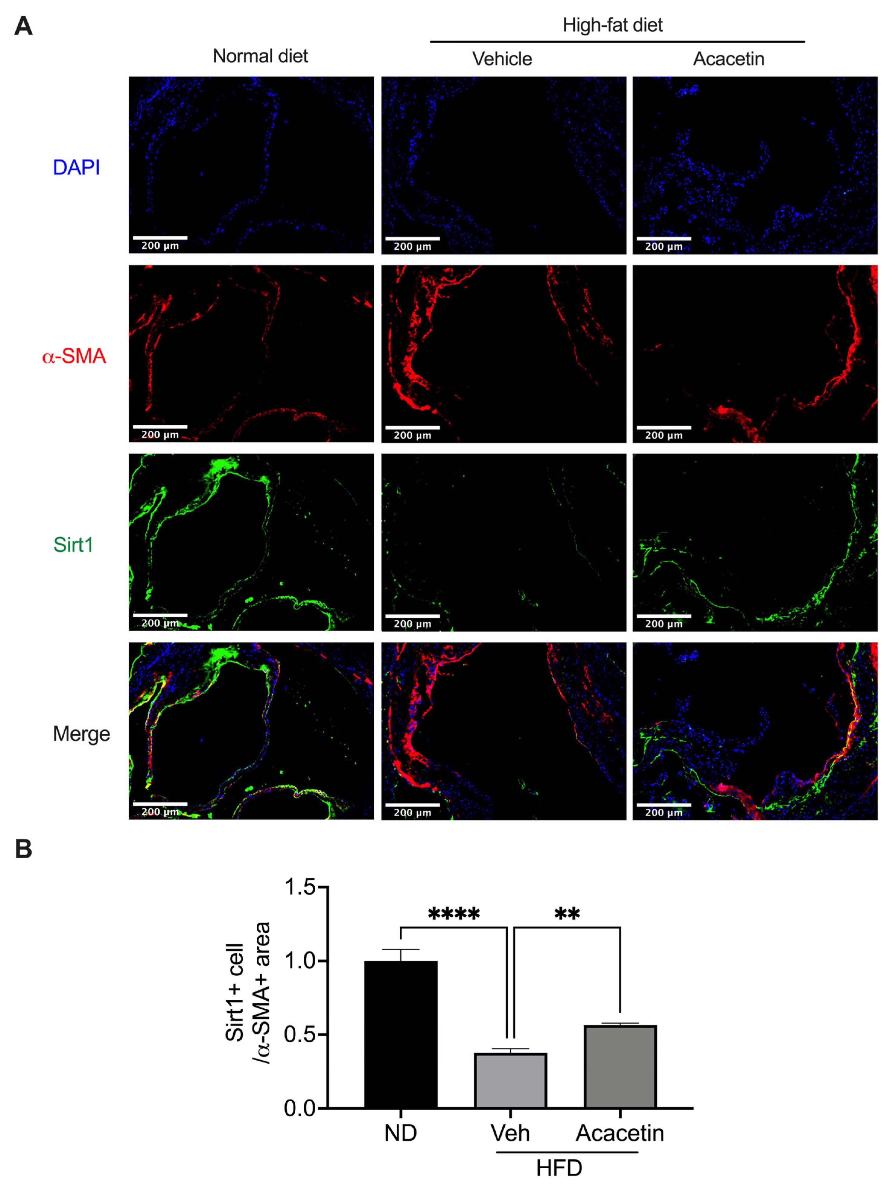 3.6. Acacetin Rescues Sirt1-Mediated Vascular Homeostasis in Atherosclerotic ApoE−/− Mice
