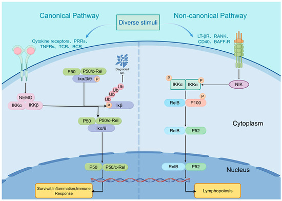 The activation of the canonical and non-canonical NF-κB pathways of stimuli induction toward NF-kB’s nuclear translocation. Created in Figuredraw. Lihui Yin. (2026) https://www.figdraw.com/.
