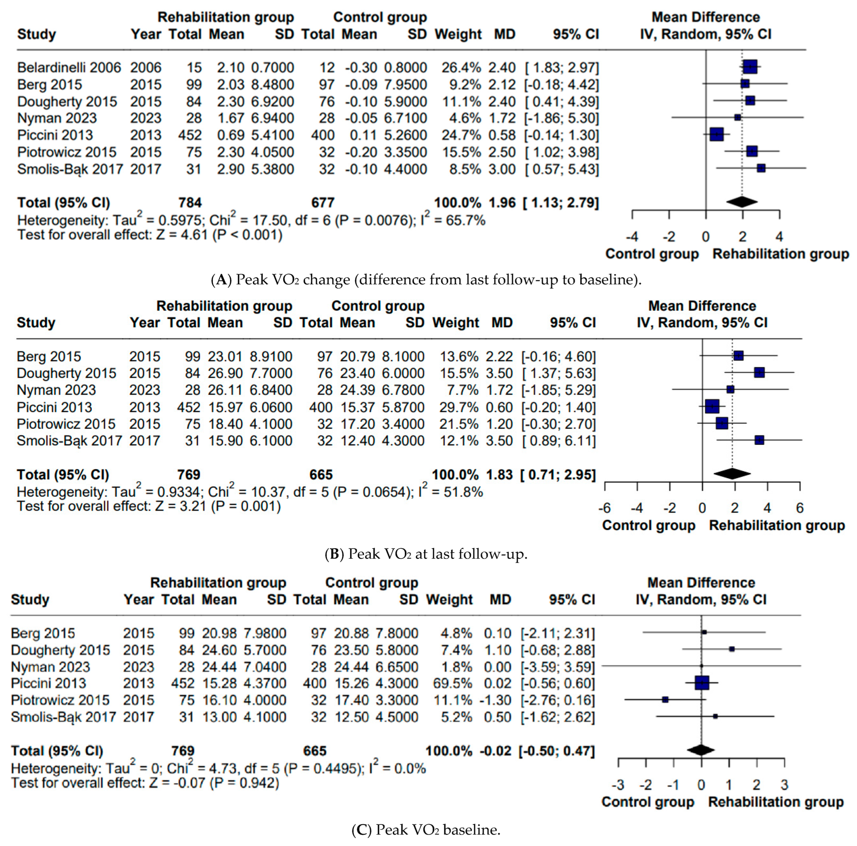 Across seven studies including 784 rehabilitation and 677 control patients, participation in CR was associated with a significant increase in peak VO2 from the baseline to the end of follow-up (MD 1.9 mL·kg−1·min−1, 95% CI 1.13–2.79; I2 = 65.7%), and this benefit remained evident when analyzing peak VO2 at the final assessment (MD 1.83 mL·kg−1·min−1, 95% CI 0.71–2.95; I2 = 51.8%). No differences were present at the baseline, confirming a comparable starting capacity (Figure 2).