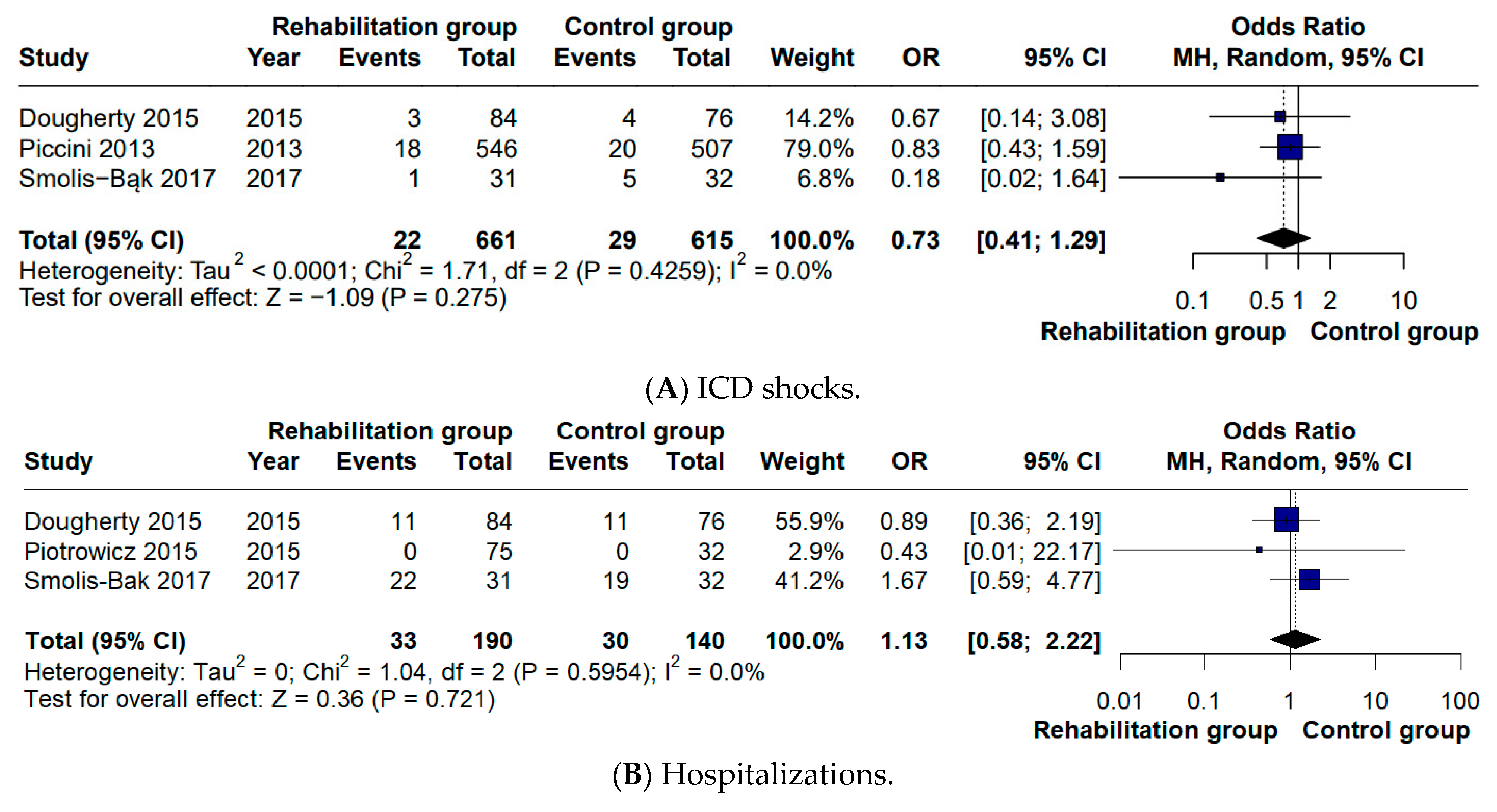 16. Nielsen, K.M.; Zwisler, A.-D.; Taylor, R.S.; Svendsen, J.H.; Lindschou, J.; Anderson, L.; Jakobsen, J.C.; Berg, S.K. Exercise-based cardiac rehabilitation for adult patients with an implantable cardioverter defibrillator. Cochrane Database Syst. Rev. 2019, 2, CD011828. [Google Scholar] [CrossRef] [PubMed]