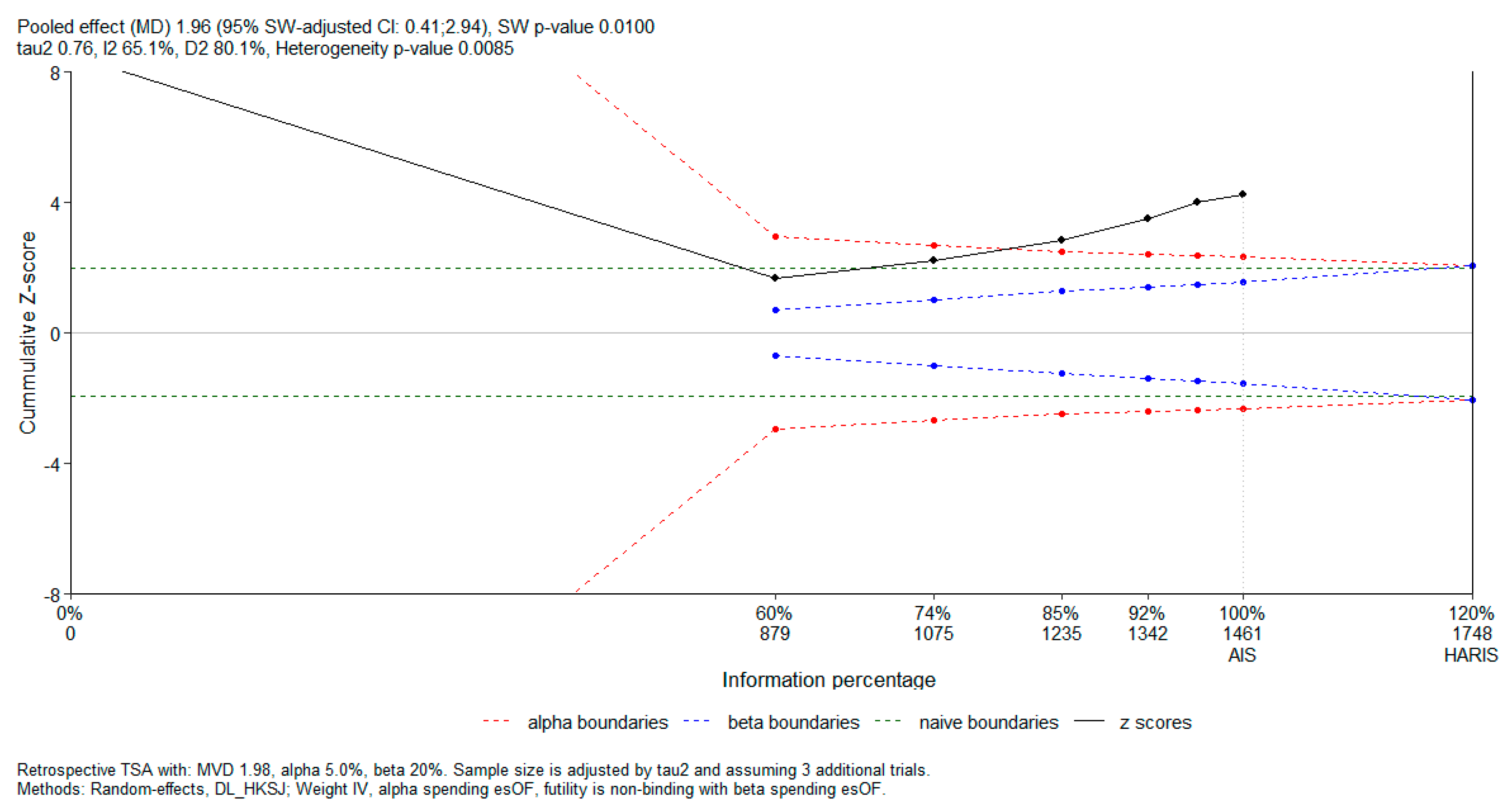 Subsequently, in order to evaluate the risk of random errors and determine whether the cumulative evidence was adequately powered, we performed a trial sequential analysis (TSA) using the RTSA package in R. The analysis was conducted for a continuous outcome, expressed as a mean difference. A two-sided type I error of 5% and type II error of 20% (power 80%) were prespecified. O’Brien–Fleming-type alpha and beta spending functions were applied for the construction of sequential monitoring boundaries. A non-binding futility boundary was used. For TSA, the required information size (RIS) was estimated under a diversity-adjusted random-effects model, using the DerSimonian–Laird estimator with the Hartung–Knapp–Sidik–Jonkman correction. Cumulative Z-curves were plotted against the sequential monitoring boundaries to assess whether firm evidence had been reached or whether further studies would be required.