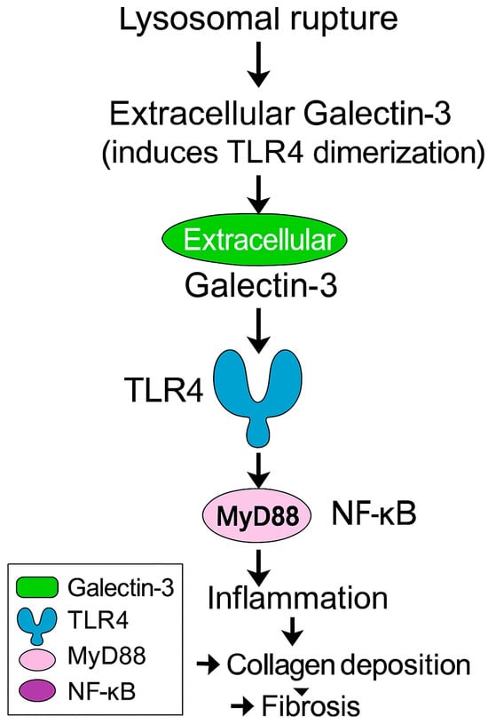 Extracellular Galectin-3 released from damaged lysosomes activates TLR4–MyD88–NF-κB signaling and promotes fibrosis. MyD88, Myeloid Differentiation Primary Response Protein 88; NF-κB, Nuclear Factor Kappa-Light-Chain-Enhancer of Activated B Cells; TLR4, Toll-Like Receptor 4.