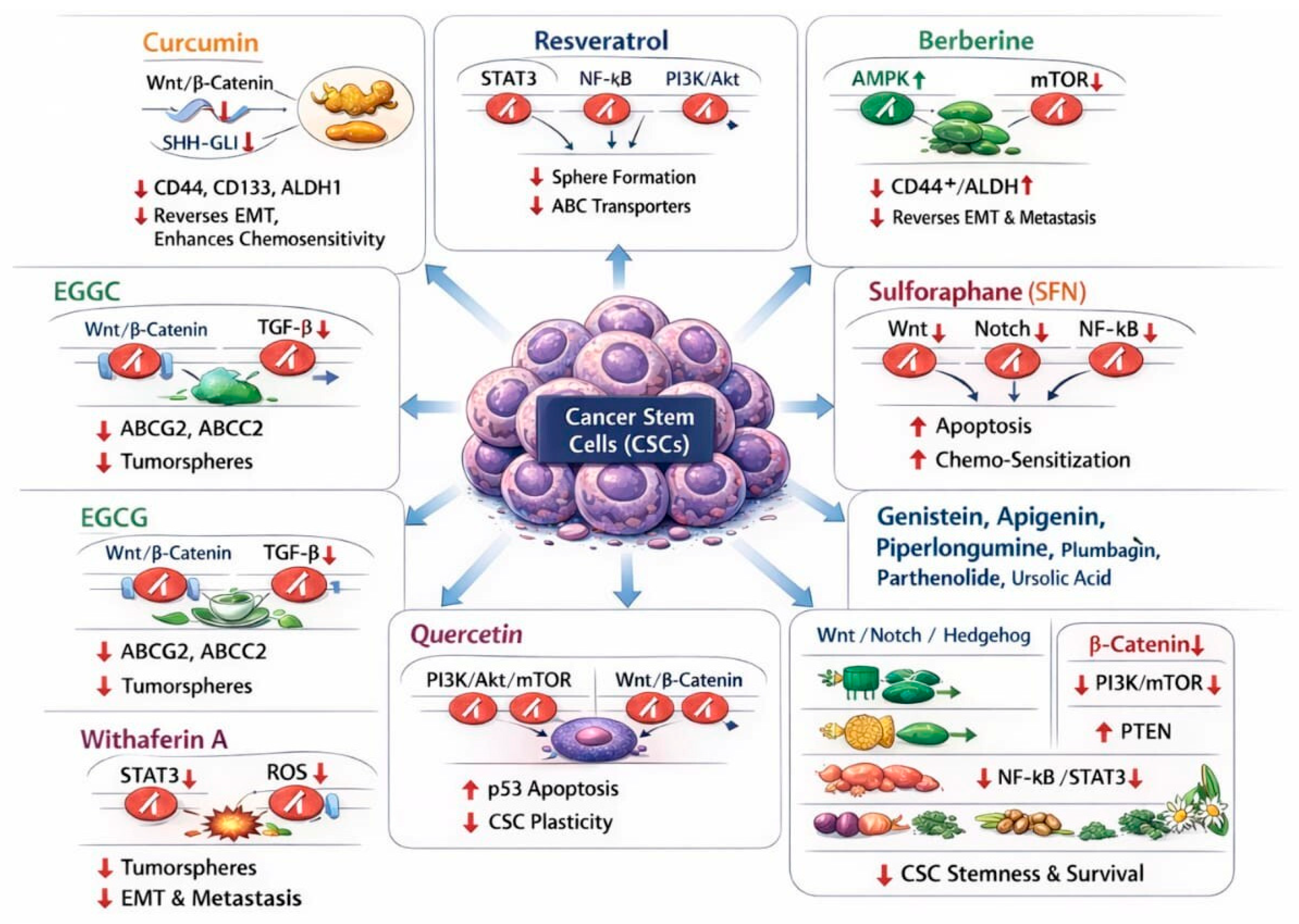 | EGCG (epigallocatechin-3-gallate) | Camellia sinensis (green tea) | Inhibits Src/JAK/STAT3 and EMT programs, reduces stemness markers and sphere formation, promotes apoptosis and chemosensitization. | Tumorsphere assays, CD marker changes, colony formation, in vivo tumor models. | Ovarian, prostate, breast, colorectal. | [133,134] |