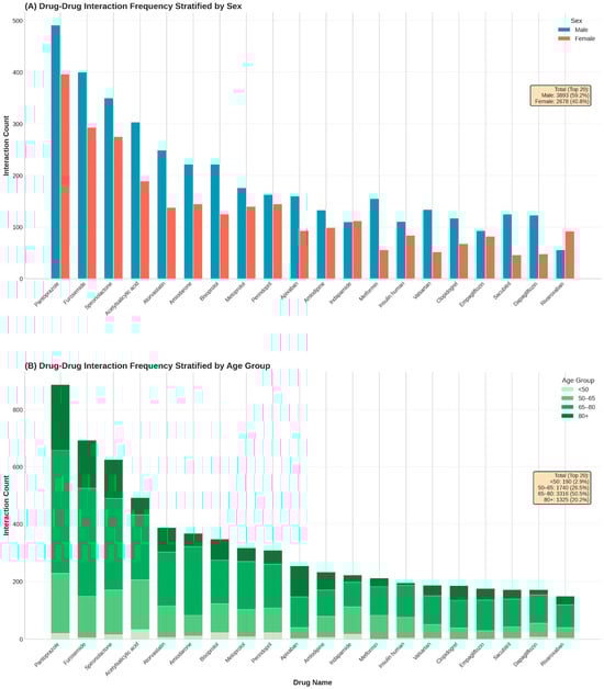 Stratification of the top 20 medications involved in drug–drug interactions by patient demographics. (A): Absolute frequency of interactions for the top 20 drugs stratified by sex. (B): Proportional distribution of interaction burden across four age categories.