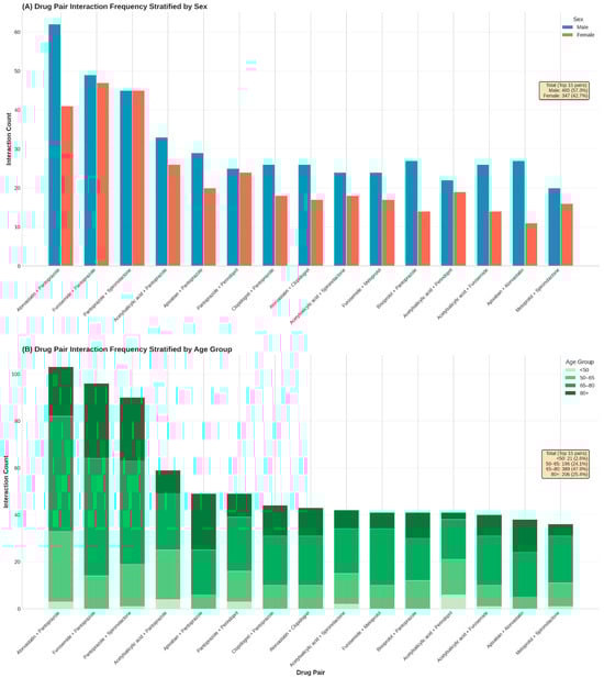 Stratification of the most frequent drug–drug interaction pairs by patient demographics. (A): Frequency of the top 15 recurrent drug pairs stratified by sex. (B): Proportional distribution of these high-frequency pairs across four age categories (<50, 50–64, 65–79, and ≥80 years), highlighting age-specific accumulation of specific therapeutic combinations.