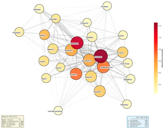 Topological visualization of the 25 most connected drugs revealed an exceptionally dense interaction network with 208 edges connecting the hub medications, corresponding to a network density of 0.693 and an average clustering coefficient of 0.730 (Figure 9). This indicates that 69% of all possible drug pairs within this subset exhibited documented interactions, and when a drug interacted with two other medications, those medications were themselves highly likely to interact. Furosemide occupied the most central position, displaying both the highest degree centrality (68 connections) and highest betweenness centrality (0.124), followed closely by pantoprazole (degree 59, betweenness 0.120). Additional high-betweenness medications included acetylsalicylic acid (0.099), spironolactone (0.091), and bisoprolol (0.080), positioning these drugs as critical structural bridges within the polypharmacy network.