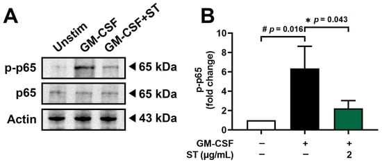 Effects of ST on phosphorylation of NF-κB in dHL-60 cells. (A) Western blotting was performed for NF-κB in dHL-60 cells. Unstim, vehicle-treated and unstimulated group; GM-CSF, vehicle-treated and GM-CSF-stimulated group; GM-CSF+ST, ST-treated and GM-CSF-stimulated group. (B) Blots were quantified by means of Image J program. Expression levels of p-p65 were normalized to Actin. Data are presented as the mean ± SD from the three separate experiments. (# p < 0.05 vs. vehicle-treated and unstimulated group; * p < 0.05 vs. vehicle-treated and GM-CSF-stimulated group).