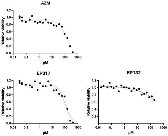 Caco-2 cell viability. Caco-2 cell viability was tested using AZM, EP317, and EP132. Cell viability decreased at higher concentrations in a similar fashion for all compounds, although EP132 shows a rather milder effect at higher dose ranges. Increasing concentrations correlate with increasing colour depth.