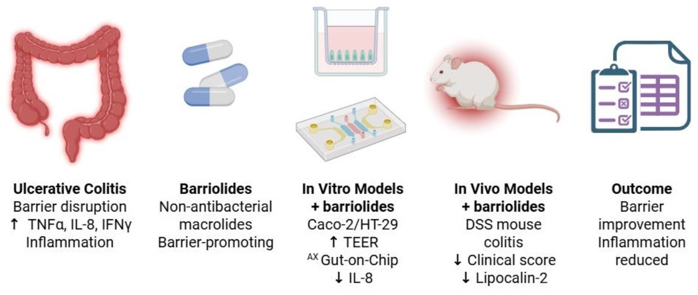 Joelsson JP, Parnham MJ, Froment L, Rapet A, Hugi A, Stucki J, Hobi N, Kricker JA. In Vitro and In Vivo Efficacy of Epithelial Barrier-Promoting Barriolides as Potential Therapy for Ulcerative Colitis. Biomedicines. 2026; 14(1):237. https://doi.org/10.3390/biomedicines14010237