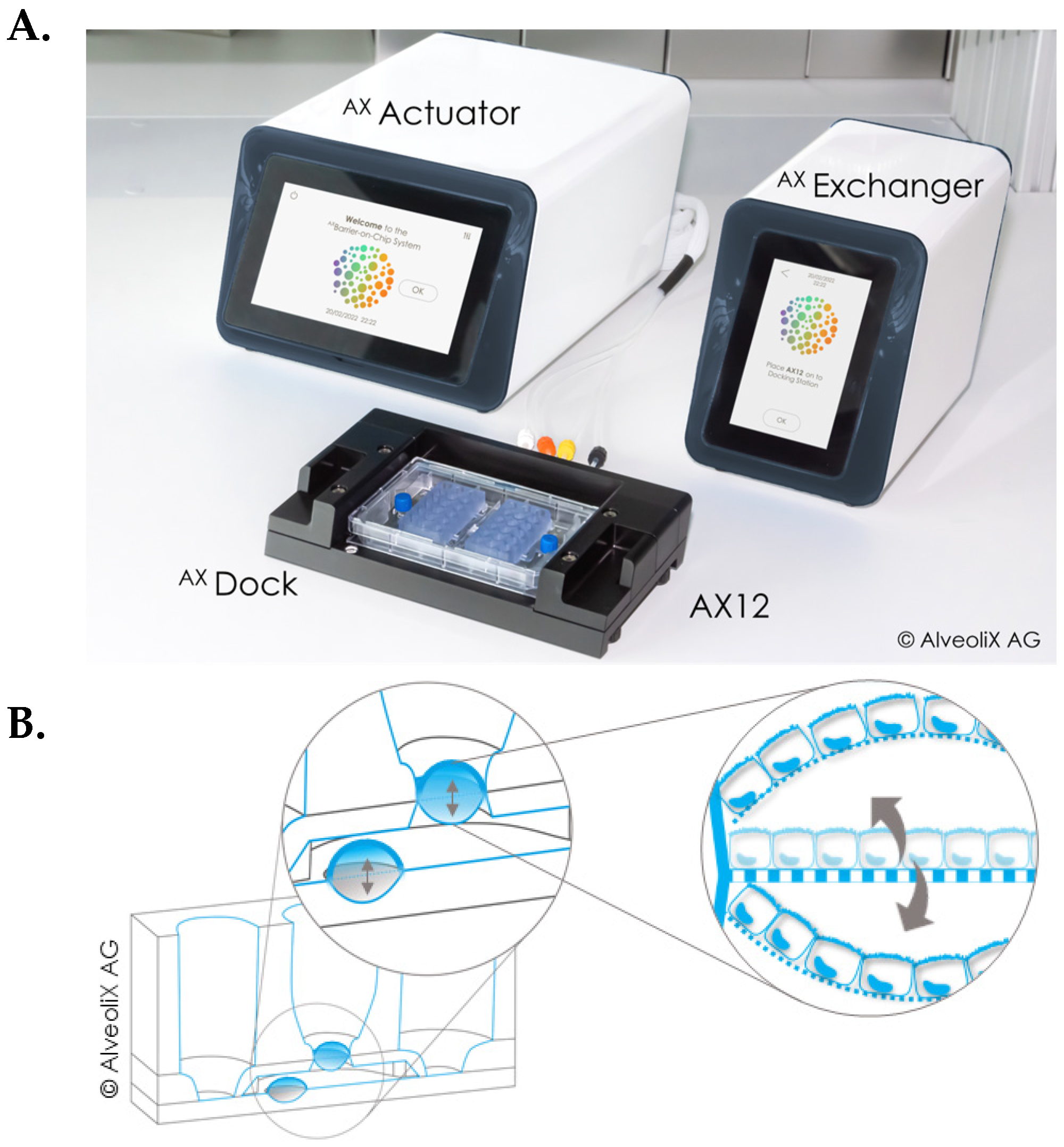 - Richter, C.; Latta, L.; Harig, D.; Carius, P.; Stucki, J.D.; Hobi, N.; Hugi, A.; Schumacher, P.; Krebs, T.; Gamrekeli, A.; et al. A stretchable human lung-on-chip model of alveolar inflammation for evaluating anti-inflammatory drug response. Bioeng. Transl. Med. 2025, 10, e10715. [Google Scholar] [CrossRef]