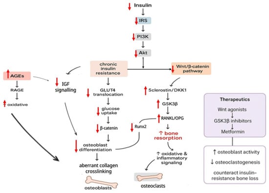 Pancreatic β cells regulate insulin secretion by assessing glucose, amino acid and lipid levels. Insulin maintains overall glucose homeostasis primarily by increasing glucose absorption in skeletal muscle and adipose tissue via GLUT4 mobilisation to the cell surface. When insulin binds to its receptor, conformational changes in the α-subunits allow for autophosphorylation, resulting in the recruitment and phosphorylation of insulin receptor substrates (IRSs). These IRSs activate PI3K, which converts PIP2 to PIP3, allowing Akt to be further activated downstream. Akt then promotes the translocation of GLUT4 to the plasma membrane, which boosts cellular glucose absorption. Akt also inhibits the action of GSK3β, which promotes glycogen synthesis and contributes to metabolic stability. Since key metabolic pathways overlap with skeletal signalling networks, insulin’s actions extend to regulating osteoblast survival, maturation and extracellular matrix deposition [69]. Insufficient insulin production or peripheral insulin resistance disrupts insulin signalling, affecting PI3K/Akt, canonical Wnt/β-catenin and the RANK/RANKL/OPG axis. These pathways are important for bone physiology. Reduced insulin availability inhibits PI3K/Akt activity, lowering osteoblast viability, Runx2 expression, glucose uptake by bone-forming cells and matrix synthesis. Under normal settings, PI3K/Akt activation can boost OPG expression while suppressing RANKL, limiting osteoclast growth and promoting net bone formation [70]. Insufficient insulin disrupts Wnt/β-catenin signalling, resulting in increased synthesis of Wnt inhibitors such as sclerostin and DKK1, which activate GSK3β and accelerate β-catenin destruction. As a result, osteoblast development diminishes, mesenchymal stem cells transition to adipogenic fates and marrow adiposity rises, all of which degrade bone integrity. As GSK3β lies at the intersection of PI3K/Akt and Wnt pathways, disturbances in either pathway affect β-catenin-dependent regulation of the OPG/RANKL ratio. In insulin-deficient states, reduced OPG levels facilitate osteoclastogenesis and heighten bone resorption [71].