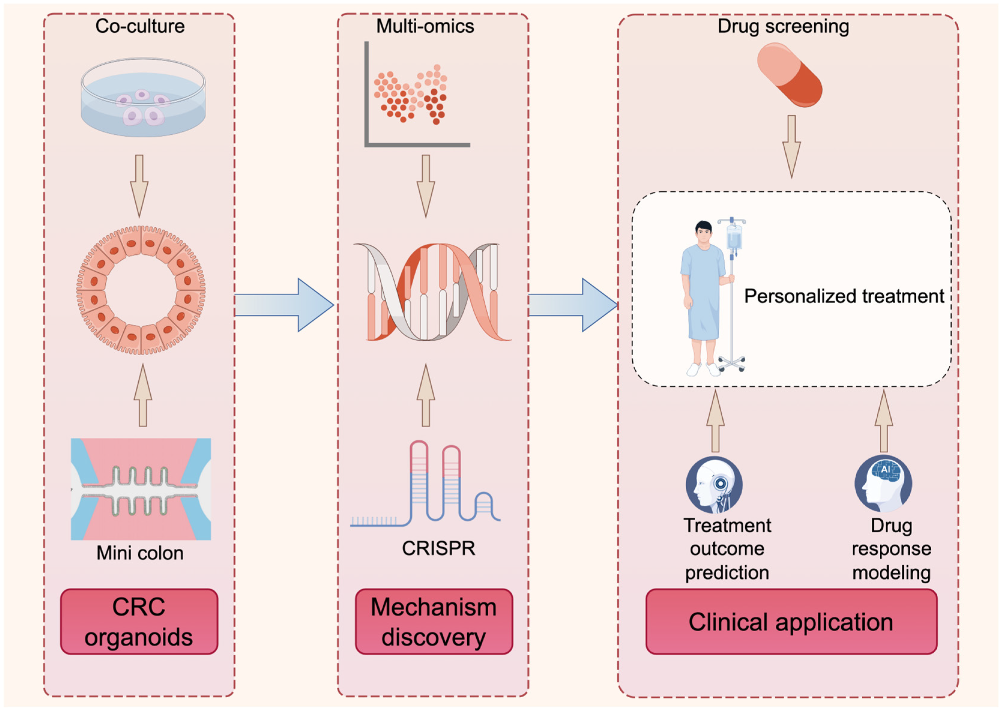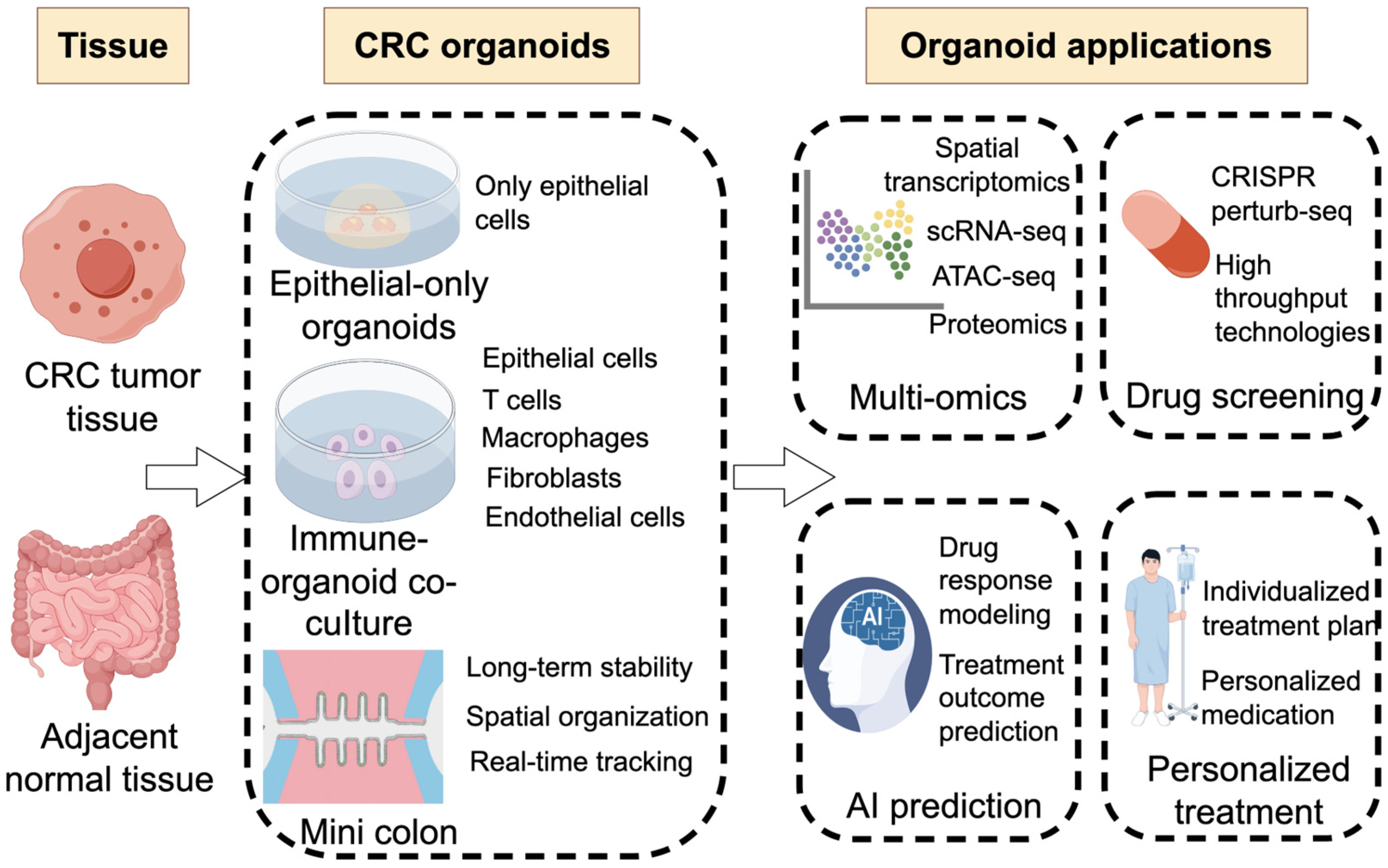 We anticipate that future developments in CRC organoid research will advance along three major, interconnected directions. In terms of organoid model development, organoid systems will continue to evolve from conventional epithelial-only cultures toward increasingly complex architectures, including immune co-culture models, mini-colon systems, and, ultimately, fully integrated organoid platforms that incorporate key cellular components of the TME, such as immune cells, fibroblasts, endothelial cells, and ECM. These advanced systems hold promise not only for more faithful recapitulation of the in vivo tumor ecosystem, but also for large-scale screening and automation, potentially enabling the establishment of standardized organoid factories that can be embedded into clinical trials and translational research pipelines. From a mechanistic perspective, the combination of CRISPR-based gene perturbation technologies with multi-omics profiling and real-time imaging will allow systematic dissection of gene regulatory networks, lineage plasticity, and microenvironment-dependent signaling pathways. By introducing targeted or unbiased genetic perturbations into increasingly sophisticated organoid models, researchers will be able to identify early oncogenic drivers, modulators of immune evasion, and context-dependent vulnerabilities that are otherwise difficult to capture in conventional model systems. From a predictive perspective, advances in artificial intelligence (AI) and machine learning will enable the integration of baseline molecular features (such as genomic and transcriptomic profiles) with dynamic, longitudinal data derived from organoid responses to treatment (including single-cell sequencing and spatial omics). Conceptualizing treatment response as a dynamic trajectory rather than a static endpoint will allow the construction of predictive models capable of forecasting patient-specific sensitivity or resistance to various therapies, including chemotherapy, targeted agents, and ICI. In this way, CRC organoids may gradually evolve into personalized, data-driven platforms for therapeutic optimization. These three directions are interdependent, with advances in organoid models facilitating mechanistic studies, which in turn enhance AI-driven predictive capabilities.