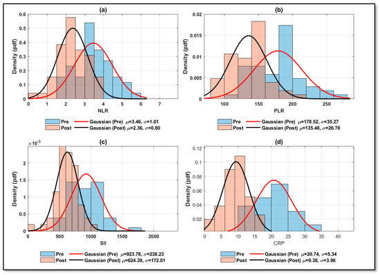 Histogram with fitted Gaussian for Pre and Post treatment: (a) NLR, (b) PLR, (c) SII, and (d) CRP.