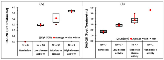 DAS28 changes (A) pre-treatment and (B) post-treatment.