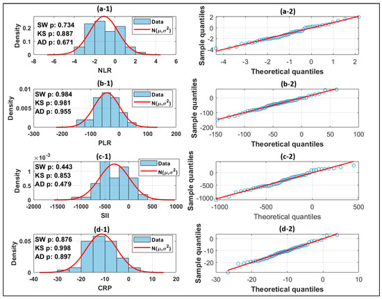 Statistical calculations, (a-1) QQ plot for NLR, (a-2) Theoretical quantile for NLR, (b-1) QQ plot for PLR, (b-2) Theoretical quantile for PLR, (c-1) QQ plot for SII, (c-2) Theoretical quantile for SII, (d-1) QQ plot for CRP, and (d-2) Theoretical quantile for CRP. The blue circles present experimental measurements, and the red line is theoretical calculation based on measurements.