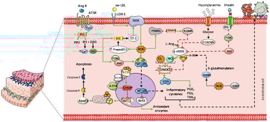 Endothelial cell apoptosis represents a potential outcome of this oxidative environment. Intracellular ROS alter the activity of endoplasmic reticulum stress sensors, such as activating transcription factor 6 (ATF6) and protein kinase RNA-like endoplasmic reticulum kinase (PERK). PERK regulates the expression of activating transcription factor 4 (ATF4), and elevated levels of ATF4, together with ATF6, are linked to increased expression of C/EBP homologous protein (CHOP), a pro-apoptotic transcription factor that translocates to the nucleus [36,37]. CHOP promotes apoptosis by inhibiting Bcl-2, a key regulator of anti-apoptotic proteins [38]. These proteins normally act at the mitochondrial level to prevent cytochrome c (cyt c) release. Once released, cyt c facilitates apoptosome formation via Apaf-1 and triggers caspase-9 activation, which subsequently activates the effector caspase-3 (Figure 1) [39].