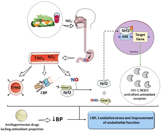In this context, diets rich in inorganic nitrate (NO3−) and nitrite (NO2−), which act as alternative NO donors [16], may be beneficial for hypertensive patients whose pharmacological treatment does not include agents with antioxidant properties. In addition to restoring tissue NO levels these anions exhibit antioxidant activity by reducing superoxide concentrations and mitigating ROS-induced cellular damage [17,18,19].